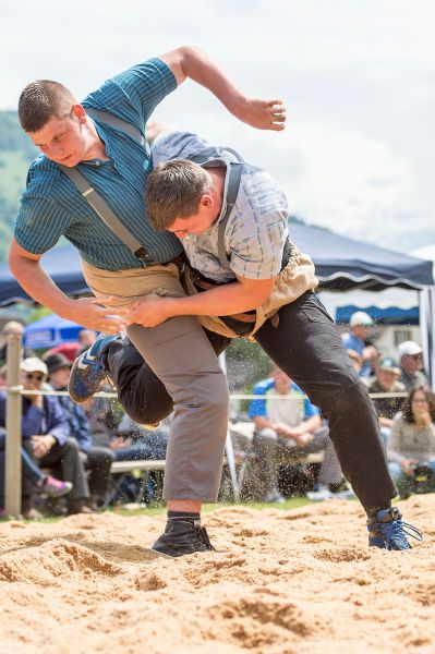 für den Bündner Schwingerverband antretenden Dominik Schmid aus Sargans. Bild: Samuel Giger (re.) im Kampf mit Christian Rentsch (Foto: Werner Schaerer)