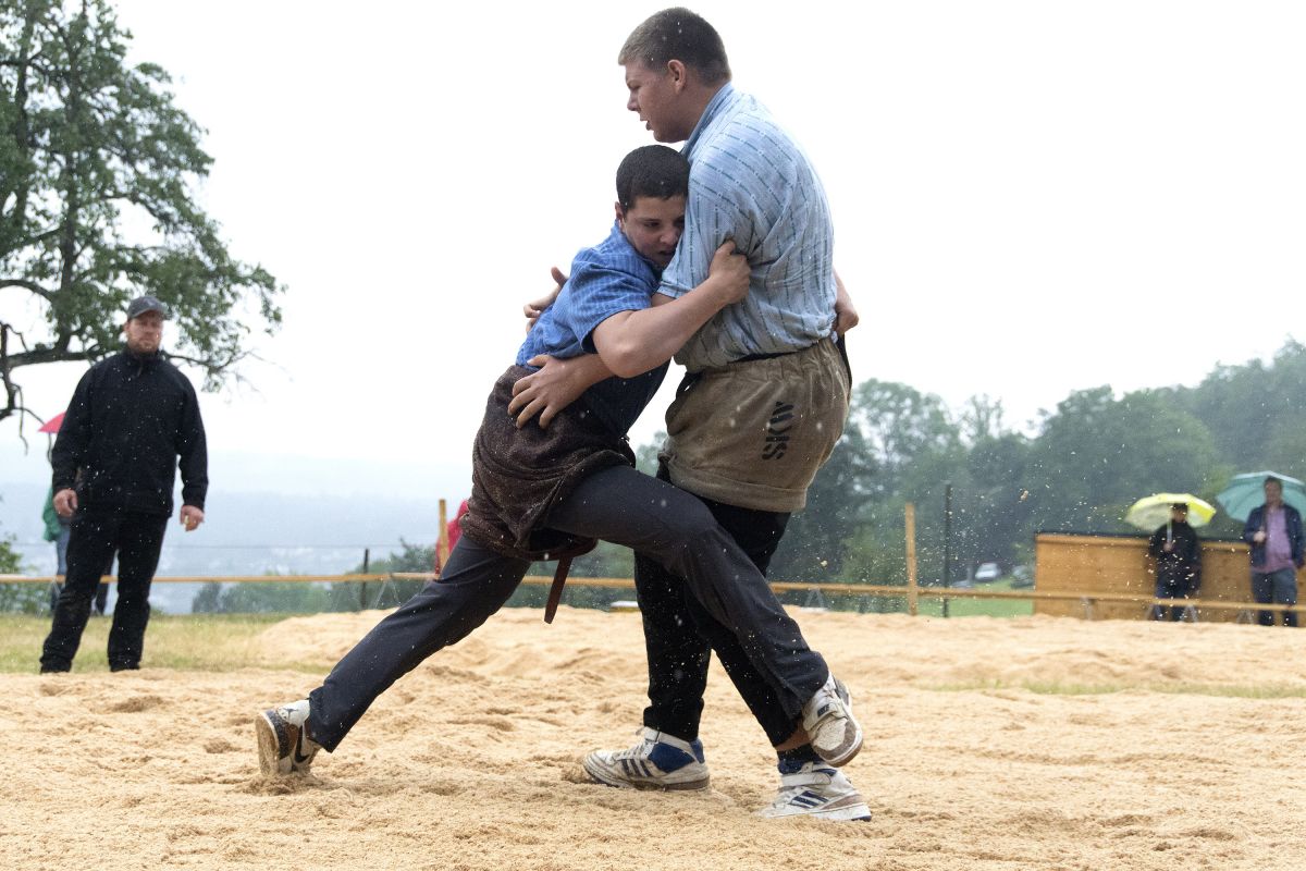Beim Bruederschwinget in Bachenbülach stiegen gleichzeitig mit den Aktivschwingern auch 80 Jungschwinger ins Sägemehl. Die 8- bis 15-jährigen Nachwuchsschwinger zeigten den zahlreichen Zuschauer einen animierten Wettkampf. Wie im letzten Jahr wurde der Anlass mit einem Wettkampf der Nationalturner kombiniert.