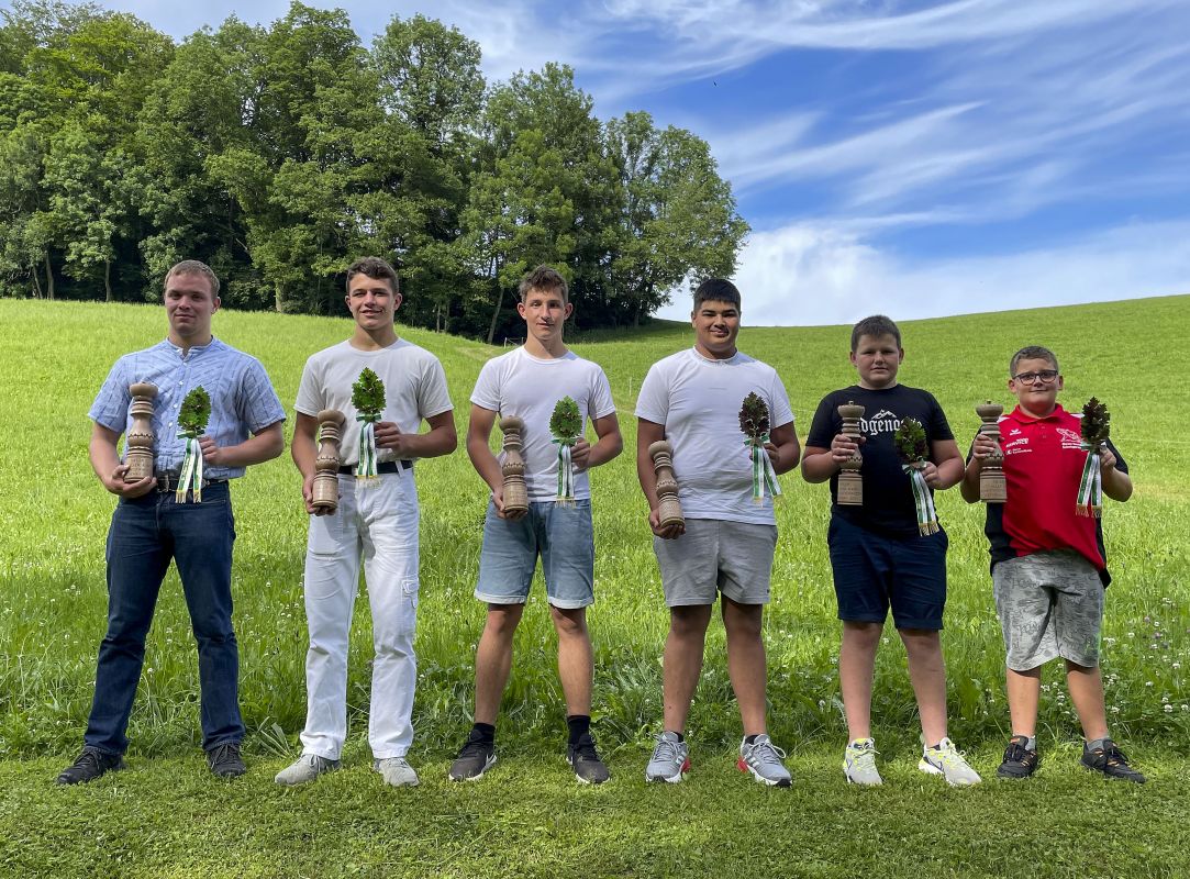 - Magdenau SG, 26. Juni 2021, Schwingen - St. Galler Kantonalschwingfest 2021. Die Festsieger - Tobias Schoenenberger, Andrin Habegger, Niculin Engi, Appiwat Grob, Kevin Rusterholz und Nino Marti. (Pascal Schoenenberger)