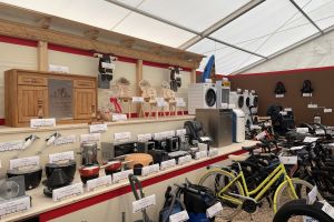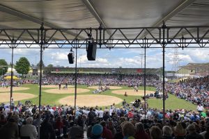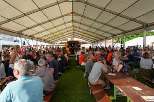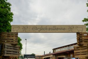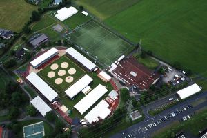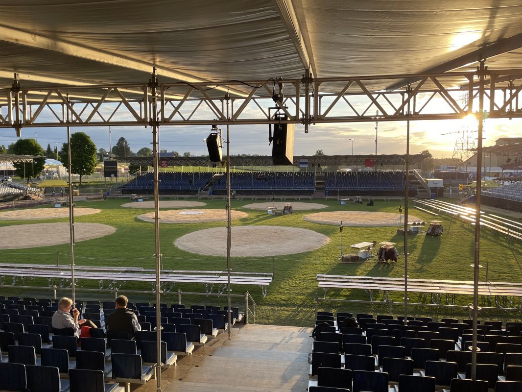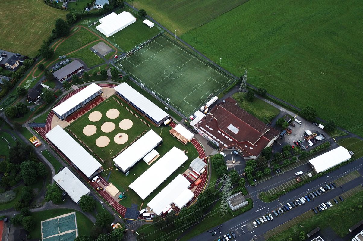 - Blick von oben auf das Festgelände mit der imposanten Arena bei der Chärnshalle Rothenburg.