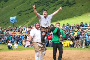 Urban Raschle aus Balzers gewinnt das Sertig-Schwinget. Im Schlussgang bezwingt der 20-Jährige Roman Hochholdinger.
