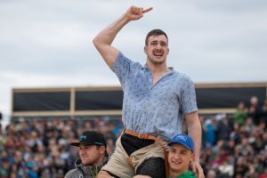 Im Schlussgang bezwingt der Toggenburger Sennenschwinger Damian Ott aus Dreien, den Thurgauer Eidgenossen Domenic Schneider, Friltschen nach 2.55 mittels linkem Gammen platt. Ott gewinnt das Thurgauer Kantonalschwingfest zum ersten Mal.
