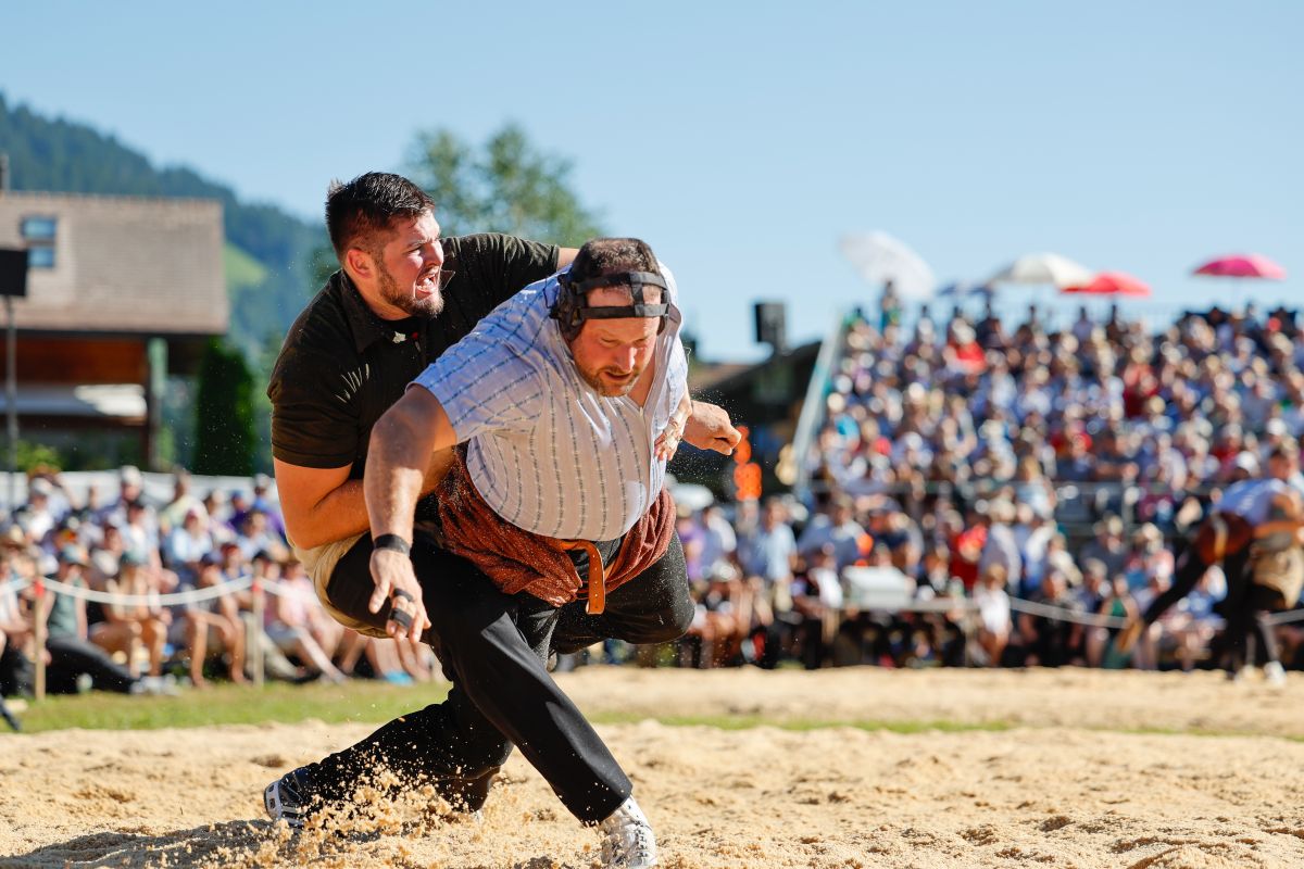 - 250629, Oberländisches Schwingfest Adelboden, Schlussgang, Staudenmann Fabian (o.) - Thöni Ivan (u.)