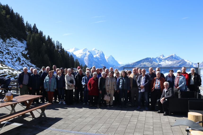 Draussen auf der Sonnenterasse, in luftiger Höhe, wurde ein feiner Apéro serviert. Mit herrlichem Blick auf die Bergwelt mundete der servierte “Weisse“ noch besser! Vor dem Mittagsessen begrüsste Schwingerfreund und Mitglied der Geschäftsleitung der Bergbahnen Meiringen-Hasliberg AG, Simon Schmid, die vom Unterland angereisten Baselbieter Schwinger-Veteranen persönlich und hiess sie willkommen. Er vermittelte der Gruppe einen interessanten Einblick in die Strategie und die zukünftigen Herausforderungen des vielseitigen Betriebes. Die Mittagszeit rückte näher und ein feines Mittagessen im Restaurant Mägisalp wartete auf die Gruppe. Es blieb auch genügend Zeit zur Pflege der Kameradschaft. So wurden unter Anderem die vergangenen Schwingfeste thematisiert und heiss diskutiert. Diejenigen, welche noch mehr Höhenmeter erleben wollten, fuhren mit einer weiteren Gondelbahn zum Alpen-Tower auf 2’500 Meter über Meer. Oben angekommen bot sich den Schwinger-Veteranen eine einmalige Aussicht auf die Alpen.